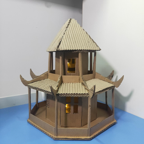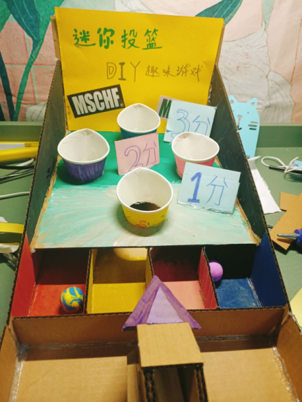 在短短几天时间里,许多充满创意、大胆新奇的作品被投稿,“迷你投篮”将纸杯玩出新花样,“纸城堡”让废纸五彩缤纷,古楼建筑“涌”起……三层楼高的城堡,红色亮眼的尖角屋顶,色彩感满满的外墙,包装盒的外表颜色合理的利用为城堡墙体增加别样的色彩感,增添靓丽的外表。迷你投篮趣味游戏台,小球的弹跳力,进入不同的分数篮中,废旧一次性纸杯做为篮架,纸盒动手创作作为游戏台。坡度的倾斜为游戏增加体验感与趣味感。