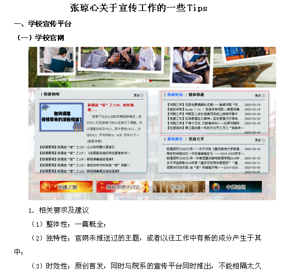 2020年3月26日上午10:00,开展了以“吹响宣传集结冲锋号”为主题的完满沙龙,旨在自觉承担起举旗帜、聚民心、育新人、兴文化、展形象的使命任务。张琼心老师就宣传工作如何更好开展以及如何更好写出高质量的新闻稿给出一些Tips。副院长何燕老师提出,各个专项工作在这个关键时期都要踊跃发声,坚持正确的政治方向,在关键处、策划上下功夫,在质量上、水平上下苦心,统一思想,凝聚共识,聚焦媒体赋能,守好四大板块!通信与物联网工程学院继续坚持以学生为中心的创作导向,以“宣传之力”增辉“通信之赞”,为高质量书写创新实践通信新篇章提供强有力的思想保证、舆论支持、精神动力和文化条件,坚持讲述好通信故事、传播好通信声音,营造好通信文化。