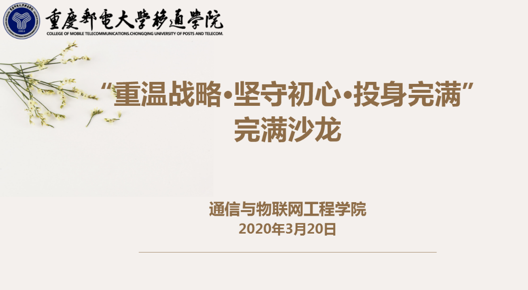 2020年3月20,开展了以“重温战略·坚守初心·投身完满”为主题的完满沙龙。王征副校长在年会上以《为学生创造价值和感动——中国新商科教育集团的战略重温》为主题发言,结合工作中的所见所思,对集团战略做连接和印证。通信与物联网工程学院全体辅导员学习后深有感触,一起进行了分享交流。大家一致表示,要用心用爱引导学生成为未来社会中坚力量的领导者,让每个学生都能够在完满教育中获得温暖与新的色彩。
