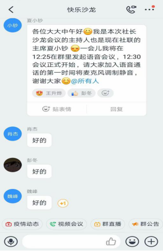 首先各社团负责人依次通过语音交流总结社团近期所产生的问题以及对于艺术节开展方案的提议。社团所面临的问题大致为三个部分。第一,宣传方式受到限制,由于线上活动只能借助线上宣传,宣传方式缺乏多样性,受众人群也具有局限性。因此大大降低活跃度与积极性,致使参与人数有所减少;第二,网络延迟是线上开展活动的一大难题,延迟使得活动进程不顺利,达不到预期效果,而活动质量也在一定程度上受到影响;第三,一部分社团因社团性质无法开展线上活动,加上设备场地等条件限制,人员数量不够等多方面因素,无法顺利开展活动。