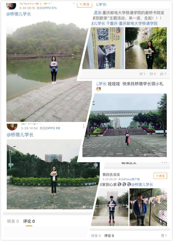 3月27日一早,廊桥书院户外一侧整齐地拉出了校园的风光照,同学只需要取下照片,到照片里的实景与照片合影即可参与本次活动,以合影的形式表达对校园“家”的喜爱,也可以在微博上“晒”自己的家乡美照,让更多朋友认识自己的家乡,了解自己的家乡。