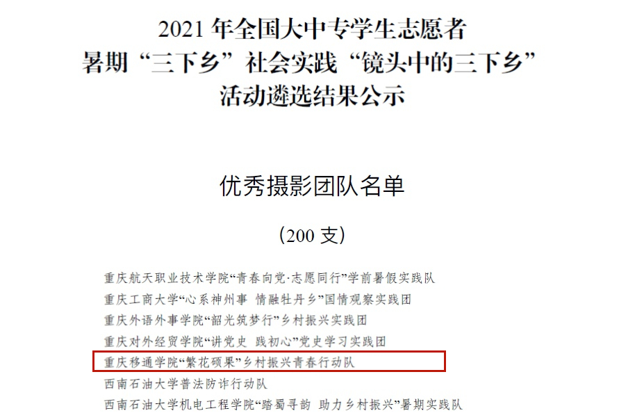 12月8日,团中央青年发展部、中国青年报、中国青年网共同举办2021年全国大中专学生志愿者暑期“三下乡”社会实践“镜头中的三下乡”成果遴选活动结果已公示,花果书院“繁花硕果”乡村振兴青春行动队斩获全国优秀视频团队奖。
