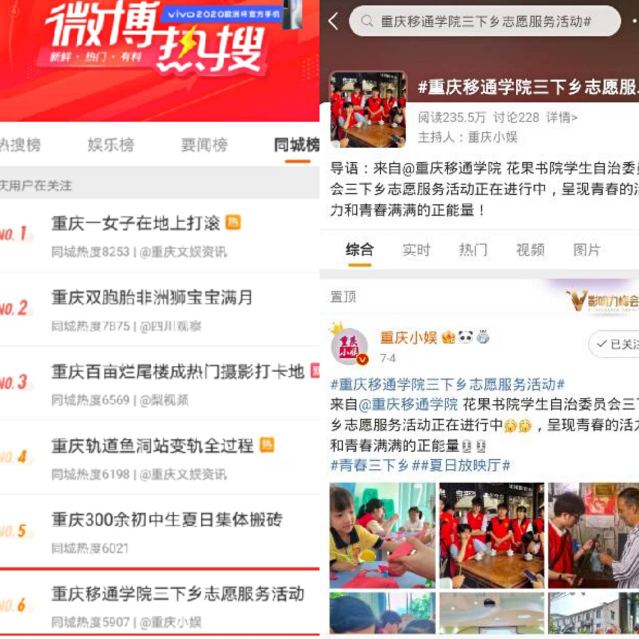 同时,我们团队不断挖掘松溉古镇特色文化,结合当地文化拍摄了《游松溉古镇,感古色古香》等3部松溉文化宣传片,并在微博、微信视频号、抖音平台投放,视频总播放量破万。同时,依托官方QQ、微信公众号、官方抖音、微博、学校官网等平台大力宣传,并在中青网、今日大学生等多家外媒成功投稿21篇,拍摄9个原创视频,稿件总阅读量和视频总播放量均破万;同时,我队三下乡活动登上微博同城热搜榜前六,话题阅读量235.4万,讨论224条,受到社会广泛关注,感召更多新青年奋进新时代!
