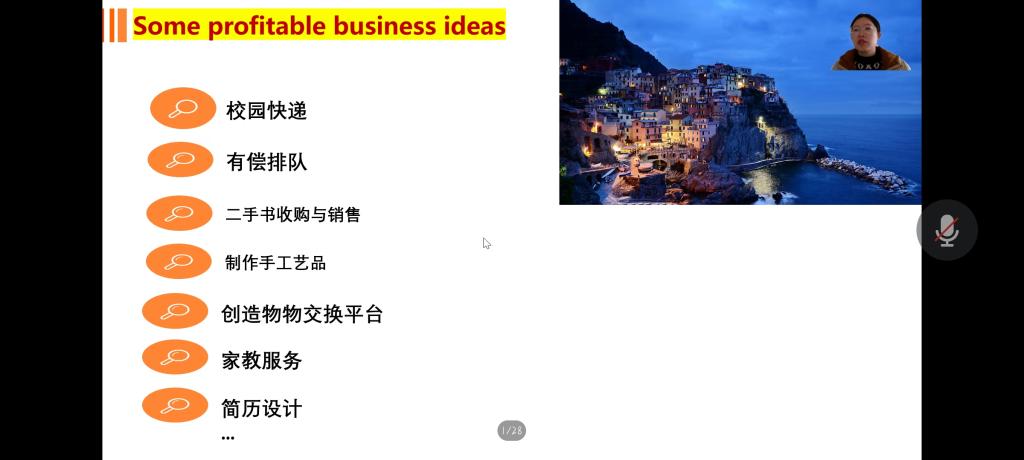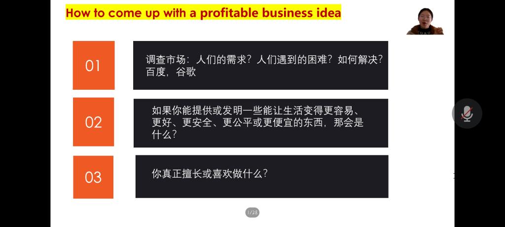 通过详细的解读后,帅老师邀请同学们自行创造一些相关的商业创意并一一在群里分享点评。帅老师从多个维度为同学们分析如何写好商业计划书并强调,一个可行的商业想法一定要延兼顾现实发展和个人兴趣,以在校学生为例,校园快递、二手书收购与销售、手工艺品、家教服务、简历设计等等都可以形成切实可行的商业计划。