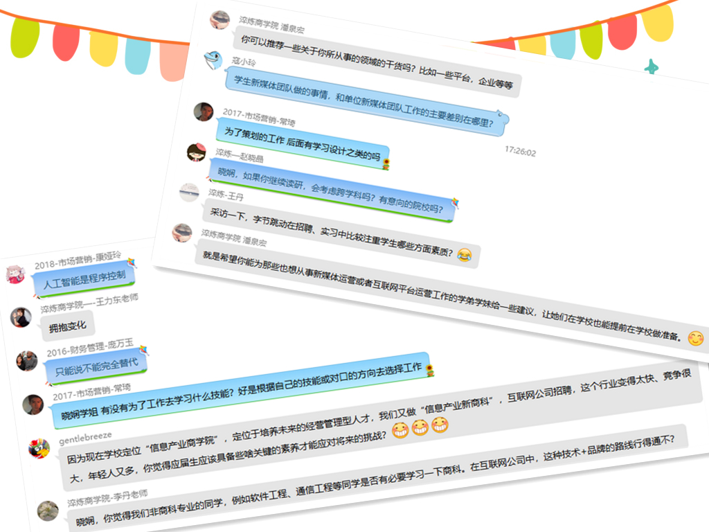 除此之外,学生的本质当是学习。学习并巩固课堂知识、积累社团活动经验、利用互联网带来的红利不断丰富自己,同时也要明确未来目标,走出校园实习,将理论与实践相结合积累经验。此外学姐在分享后还和同学们进行了交流,为同学们解疑答惑,在线为同学们传授提高自我综合能力的技巧,以互联网工作者的身份传递经验更好增进师生们对新商科的认识,让商科以及非商科的学生对自己未来的就业方向有了更为清晰的目标,更好地明确学习目标、积累经验,充实自己,为未来就业创造良好的条件。