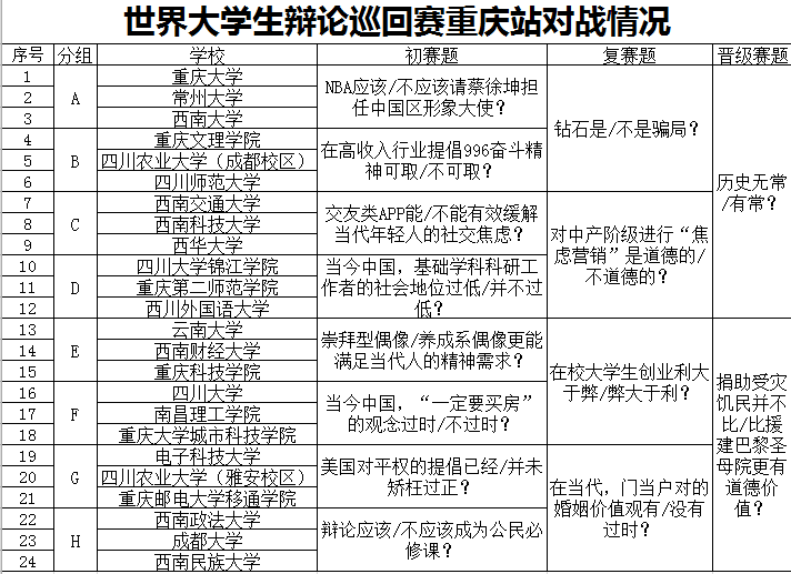 本次世界大学生辩论巡回赛赛制新颖,评委阵容强大,含金量极高。群雄逐鹿提升了比赛的难度,我校辩论队对该赛事高度重视,由队长张自强领衔,队员刘永春、张瀚蛟、王耀彬等经验较为丰富的辩手组成分队参加本次赛事,同时校辩论队的其他成员及鱼城书院思辨力训练营成员也陪同前往观赛学习。
