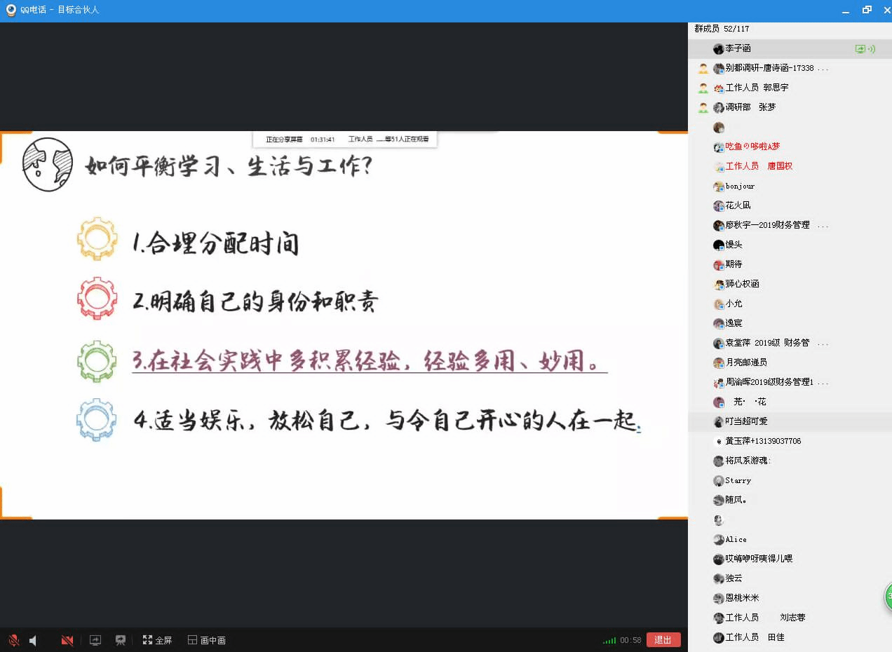 此次分享会,在近60位“合伙人”成员的讨论中圆满结束,分享会结尾,李子涵学姐强调道:“大家应该抓紧学习,当代社会需要复合型人才,同学们在走专业化路线的同时,也要多接受外界信息,使自己置身于时代,才能更好地融入这个时代。”