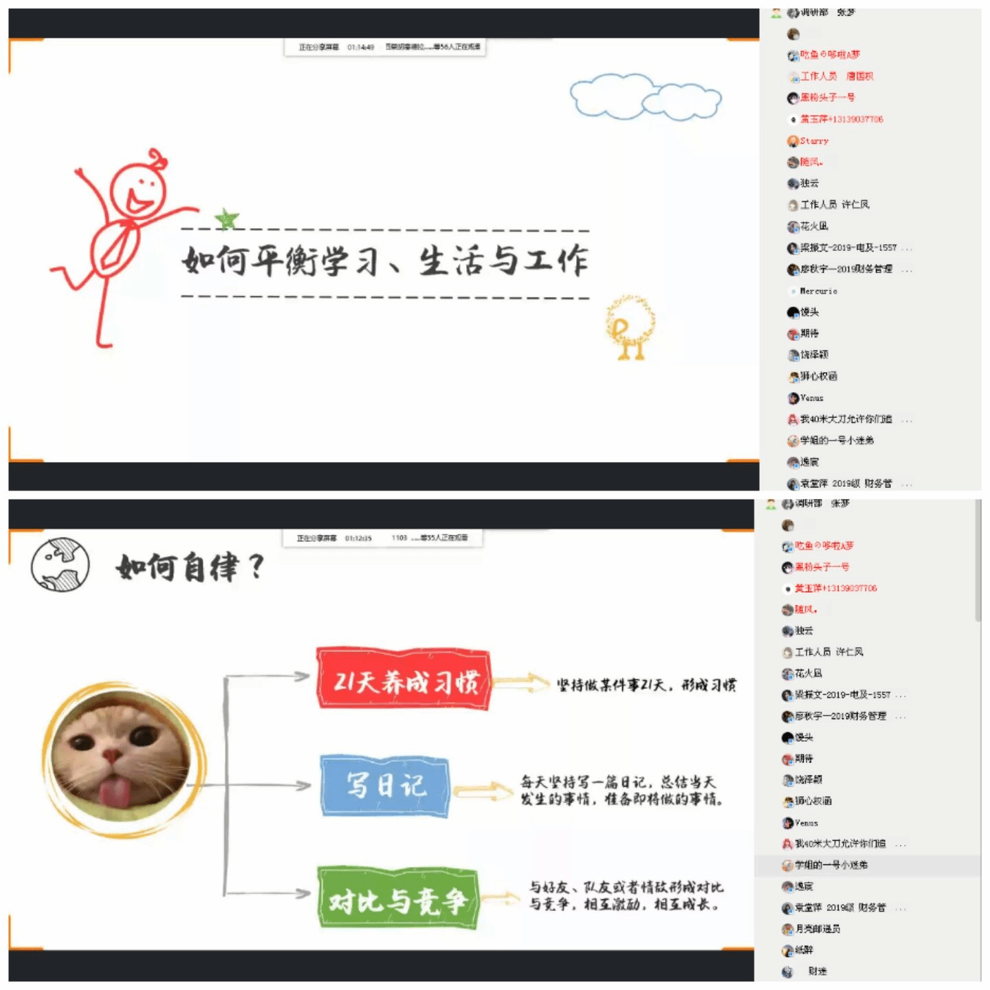 想要通过四六级考试,除了要有系统的规划与明确的目标外,还应具备强有力的自律习惯。“作为一个老生常谈的话题,人人都知道自律,但养成自律习惯的过程是异常艰难,并且需要强大的意志力”,学姐当即分享自己的坚持小窍门:“日记是对当天的一个总结,用写日记的方式记录生活,不仅有利于做事更有计划与目标,还可以让同学们养成不断坚持的习惯,坚持21天,你便会有新的收获。”同时,学姐提出,在学习中“相互激励,相互成长,朋辈互助”式的良性竞争往往是自我提升最关键的因素之一。