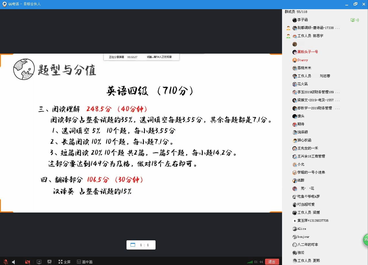 为让同学们进一步明确英语四级考试内容结构,活动伊始,学姐就英语四级题型与分值逐一进行介绍,同时为同学们剖析每个题型的得分技巧。针对具体题型,学姐给出以下经验分享:词汇量累积、听力练习、刷真题、背作文模板、考试注意事项分析等。此外,为提高同学们备考效率,学姐提供了诸多利于四级考试的网站资源和学习软件。