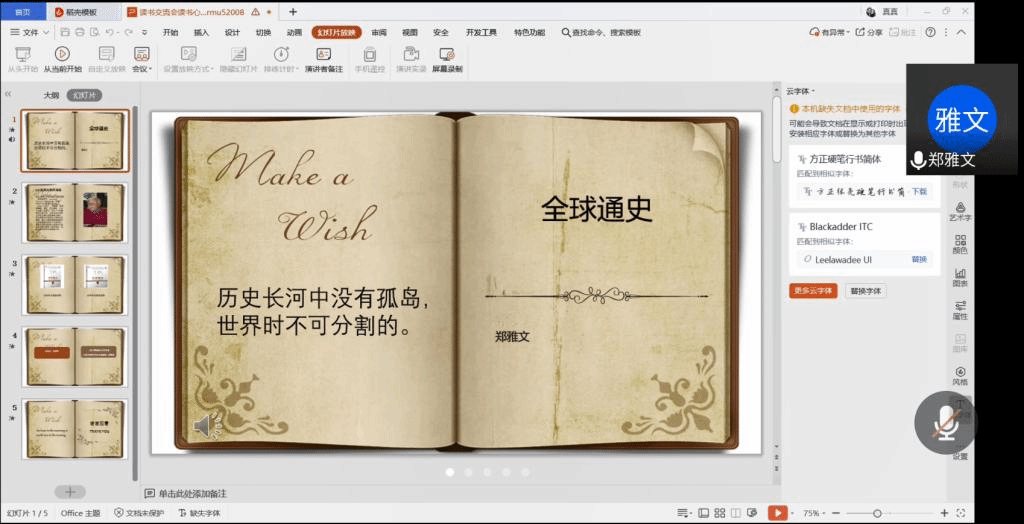综管部的郑雅文同学也向同学们推荐了一本有趣的历史书籍《全球通史》,她从这本书的优劣点分别出发,向参会同学说明了推荐这本书的理由。郑雅文认为:这本书包含了世界的历史,让人们在自己家中也可以知道世界的发展是怎么样的,但由于作者不是中国人,他对中国的了解也不是十分到位。不过,由于纵观全球的历史视角使得这本书更富多元化的理解。这也使得同学们对这本书产生了极大兴趣,纷纷在群里进行讨论。