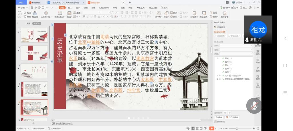 首先发言的是陈祖龙同学,他从故宫博物院的文化价值、藏馆文物、主要建筑及建筑形制、历史沿革以及名称考义等方面,给参会的所有同学展示了他眼中的故宫博物院。