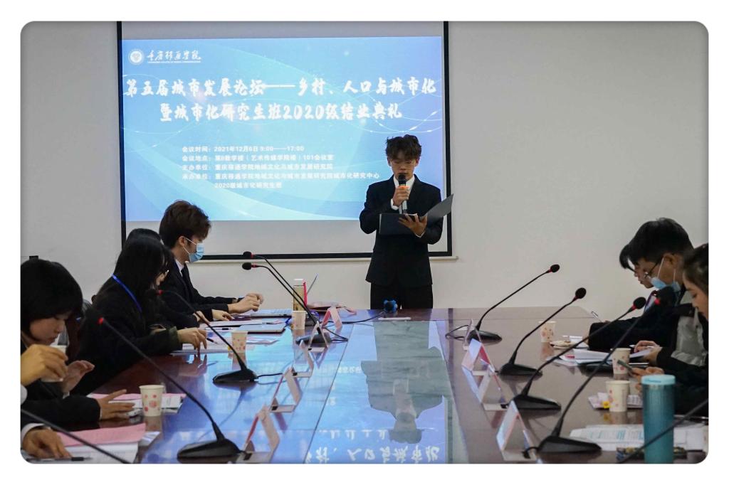 城市化研究生班是地域文化与城市发展研究院下辖的城市化研究中心开设的特色班级。其成立于2016年9月,贯彻学校“四位一体+双院制”培养理念,致力于培养学生对本土城市化的研究,采用导师制进行人才培养,通过名师授课、实地调研、学术论坛、作品出版为一体的特色教学体系,培养学生独立思考和学术工作能力。本次会议针对城市化研究生班2020级学生的论文进行研讨。两场会议,7位同学做了报告,报告内容包括綦江与合川地区城乡发展问题。