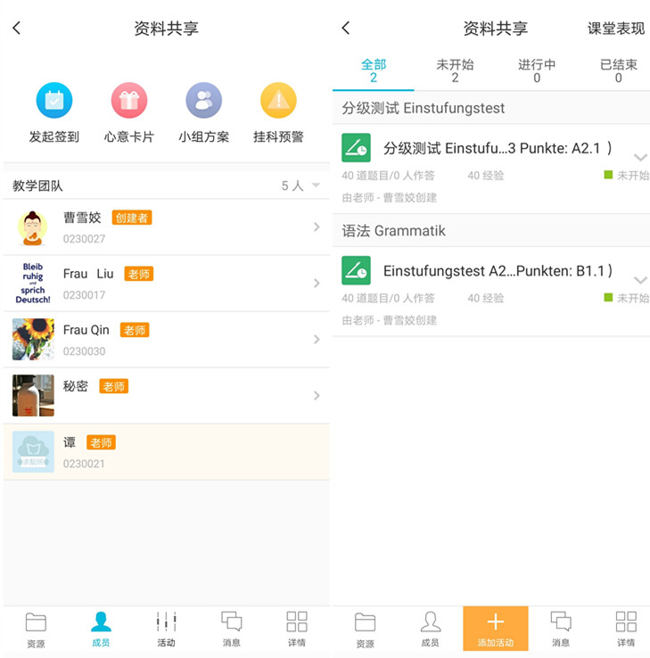曹老师简要介绍了第四单元的主题内容,并提议在云班课上创建一个德语资源共享库,老师们可上传习题、试卷、音视频文件等,共享教学资源,通过引进现代信息技术实现线上测试和批改,提高教学工作效率。
