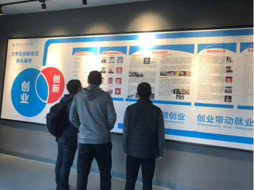 在分享与交流结束后刘杨一川、廖遥和吴靖还参观了大学生创新创业孵化基地。在参观孵化基地的过程当中刘杨一川谈到:要鼓励同学们勇于打开创新创业的新思路,同时要与市场调研相结合,更要注重理论与实际相结合,不能完全照搬理论知识。