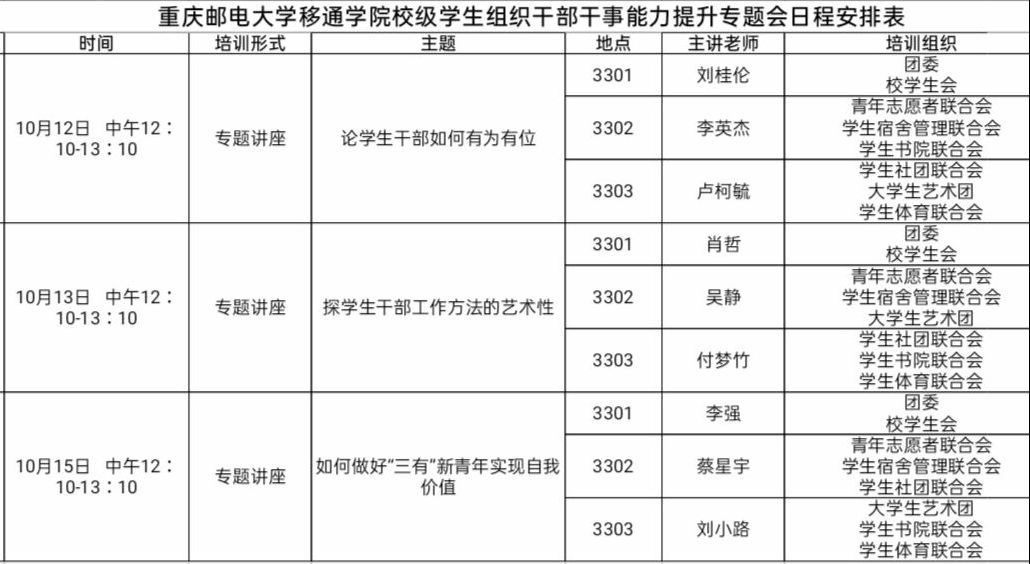 十月微凉,渐入秋季。为提高我校各级学生组织的工作效率、工作质量、工作积极性,增强我校校级学生组织干部干事的全局意识、服务意识、责任意识、创新意识,加强新一届各学生组织干部、干事的工作能力。2020年10月12、13、15日12点10分,于3301、3302、3303三个教室,同时组织并开展了学生组织赋能专项培训第一期。