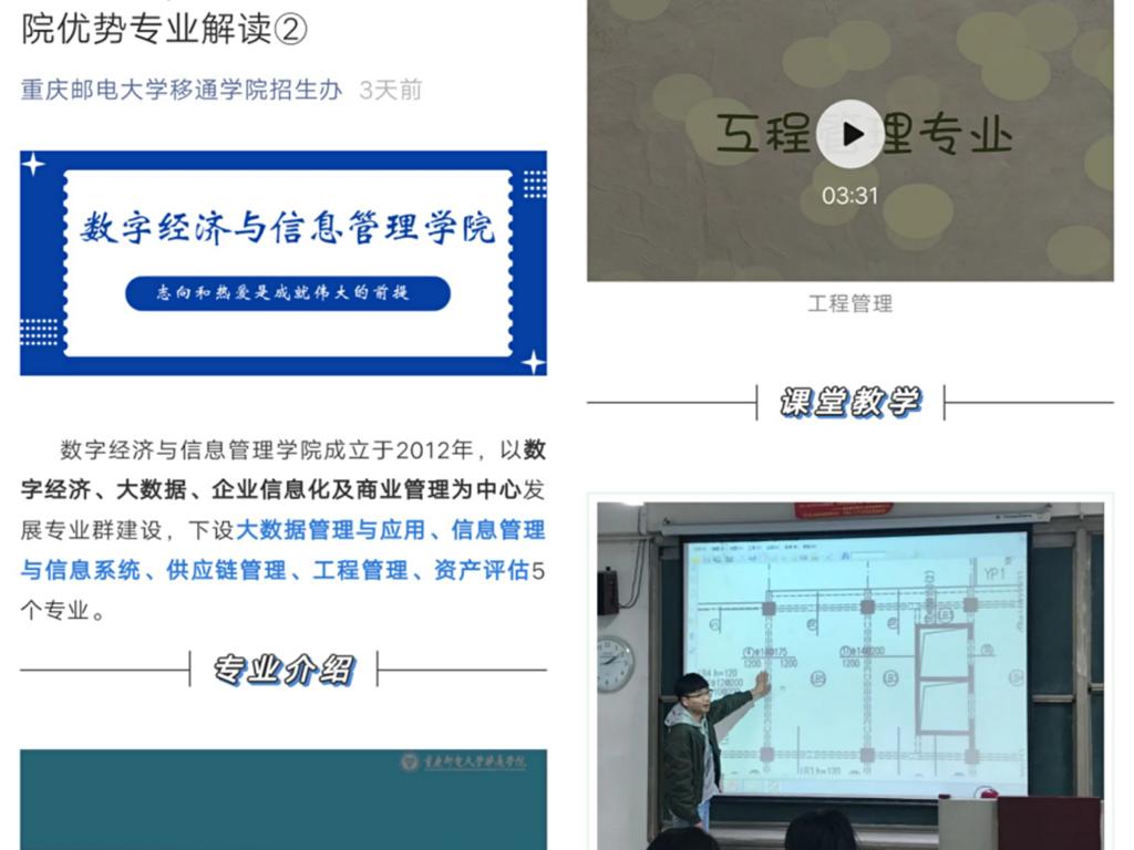 数字经济与信息管理学院于2019年12月31日由原管理工程系更名而来。由系更名为学院后,为突出学院优势,融入学校信息产业商学院的办学定位,学院介绍和专业介绍的重要性不容小觑。学院积极与招生处沟通,梳理学院各专业特点,重新定位学院专业群优势,集思广益创作出图文并茂的学院简介。