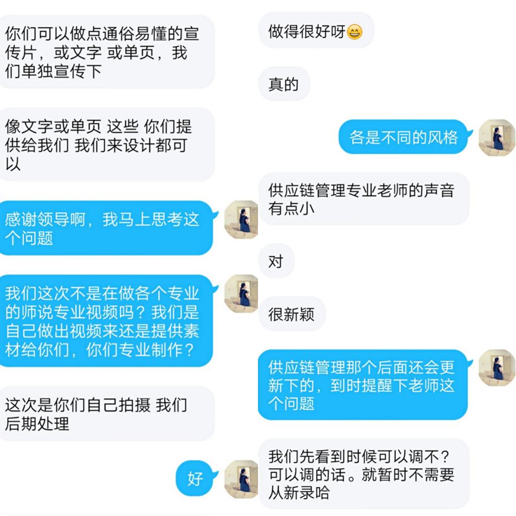 “师说专业”视频要求专业教师解读专业,并且要拍成视频。看到这个通知,学院的老师都“震惊”了,纷纷说道“我不会制作视频啊!”“我没有拍视频的软件啊!”“我一个人隔离在家谁给我录视频?”…… 困难摆在面前,只能迎难而上。“三个臭皮匠顶个诸葛亮”,集体的智慧是无限的。招生处老师帮我们梳理出“师说专业”的视频内容要点及要求,学院给出各个专业视频的风格要求和内容框架,2个教研室充分发挥在线课程建设过程中积累的“微课”视频制作经验,王哲老师利用信管专业优势和IT技能负责解决视频制作软件的各种技术问题,周梦娇老师负责团队管理与任务协调,杨凯副院长负责往届优秀毕业生素材采集,李红艳老师还鼓励自己的儿子——正在读广播电视编导的大一新生援助我们解决视频动画、字幕和变声问题,艺术传媒学院友情赞助我们解决新学院LOGO设计……齐心协力终成事,视频效果大大超出预期想象。