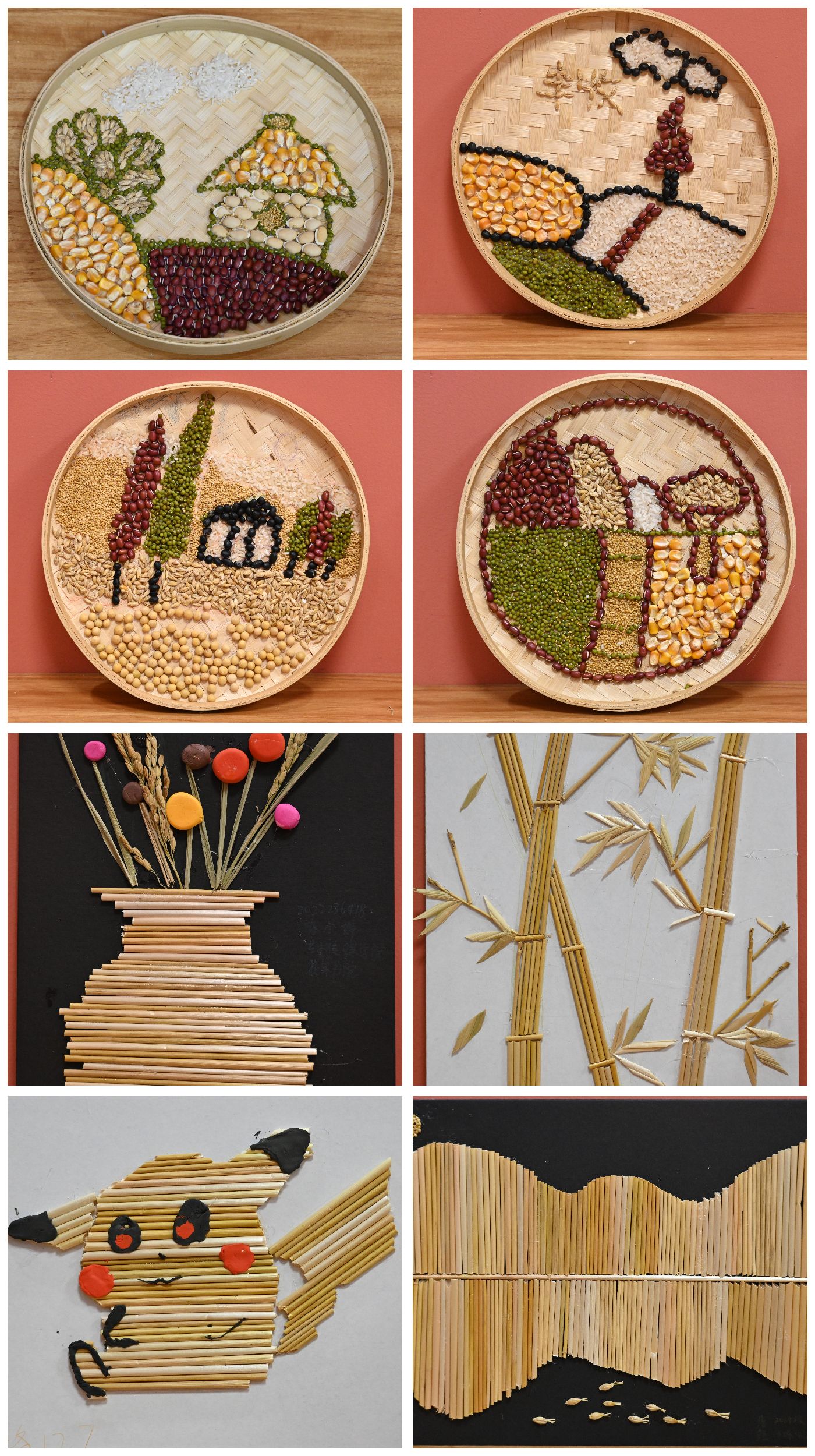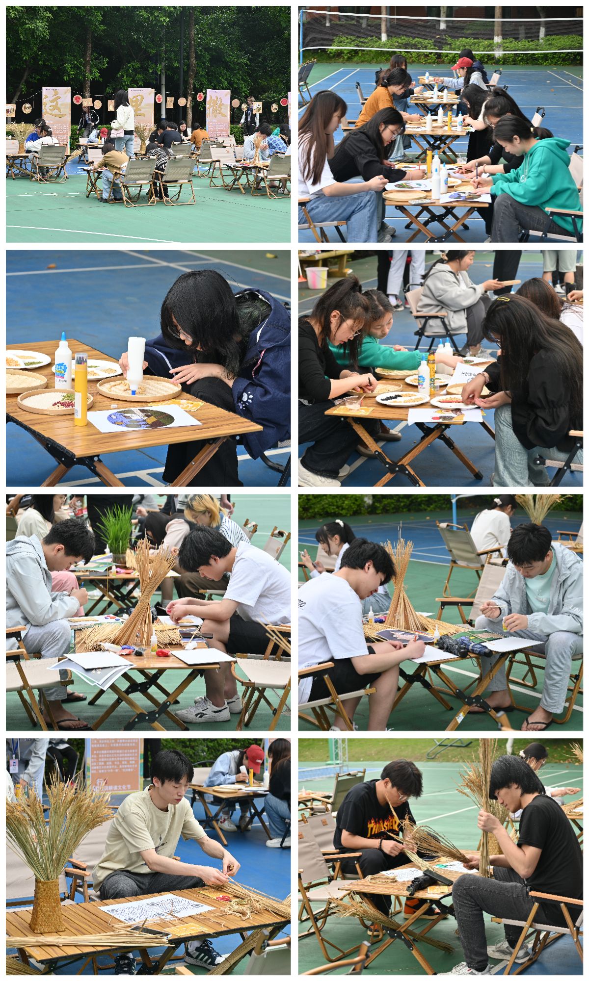 本次活动手工互动体验区设有谷物画、稻杆画与草编工艺等内容,书院学子们通过视频、画稿等方式了解与学习稻谷手作文化,并使用粘贴、拼接、手编等方式自由创意稻谷文化作品。活动现场,同学们以生活为影,以谷物为形,在竹编盘中描绘出一幅幅五彩丰收画卷;还利用麦秆本身的自然光泽和质地,通过剪裁、构型等制作工序,将花瓶、竹林、坦克、皮卡丘等多元内容创意呈现。此外,草编马、草编手环以及稻草人等各类草编作品也在同学们的巧思下逐一诞生,稻谷文化与传统手工艺的奇妙结合,旨在引导同学们在手动实践过程中亲身感受先辈的劳动智慧。