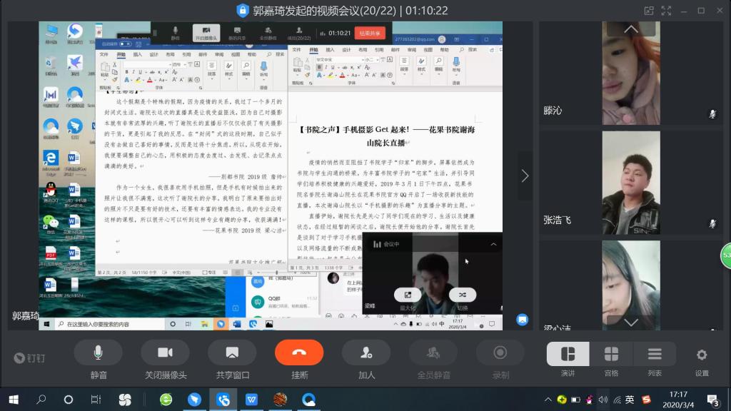 因为疫情的原因,同学们目前还没有办法相聚在校园,但书院平日里的朋辈课堂还在有序进行着。尤其是最近,为加强同学们的文稿撰写能力,加强书院学生宣传队伍的建设,花果书院学生发展导师郭嘉琦通过视频会议的形式给花果书院学子们开启了新闻稿撰写系列项目,也为同学们开学后的学习做好了详细的规划与安排。