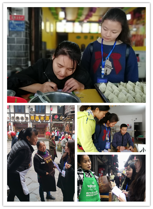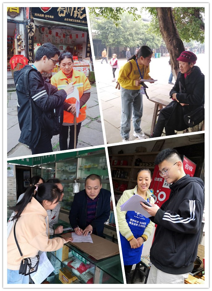 在调研正式开始之前,老师们强调了具体工作和注意事项。店铺、商贩、保洁人员、保安人员都是同学们的调研对象。但周六游客比较多,给调研造成了一定困难。同学们为了获得更多的样本,还对古镇附近的商铺和居民点进行了随机调查。