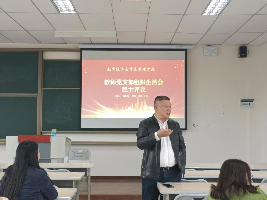 为深入学习贯彻党的二十大精神,坚持不懈用习近平新时代中国特色社会主义思想凝心铸魂,查摆问题深剖析,整改落实抓党建,数字经济与信息管理学院教师党支部于3月15日14:00召开支部组织生活会暨民主评议党员大会。本次会议由支部书记刘贵容同志主持,教师支部全体党员参会。