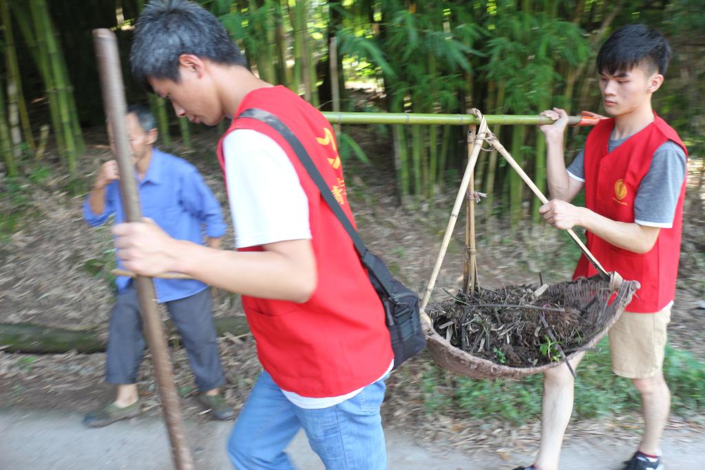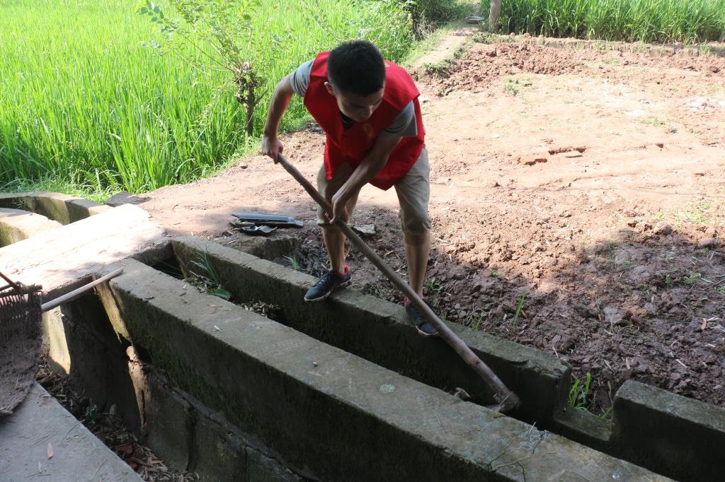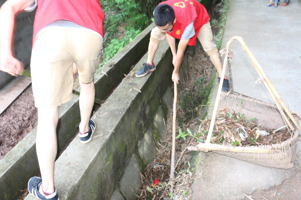 蒋世贵爷爷年逾七旬,和老伴儿一起带着智力低下的女儿,一家三口居住在村政府为他们申请国家补贴重新修建的民生工程房舍里。我们一行十多人的到来,使得年迈的蒋爷爷不知所措,通过村上工作人员的简短介绍后,明白了我们的来意,笑着将我们迎进屋。寒暄之后,帮扶团的志愿者们就顶着烈日拿起锄头开始为蒋世贵爷爷修理残破的院坝,清扫满是枯叶、灰尘的小道,清理堵塞不通的阴沟。烈日当天,别说劳动,仅仅是站着不动,也会汗如雨下,但没有一个人退缩逃跑,大家伙儿你拿锄头,我拿铁锹,整理屋前屋后,笨重的工具使得久未劳动的志愿者们行动起来更显吃力。汗水流出来,侵湿了衣衫,也侵润了大家伙儿的心灵:不管生活多么艰难,也要有一颗继续克服困难的决心,好日子在努力之后总会来临的!