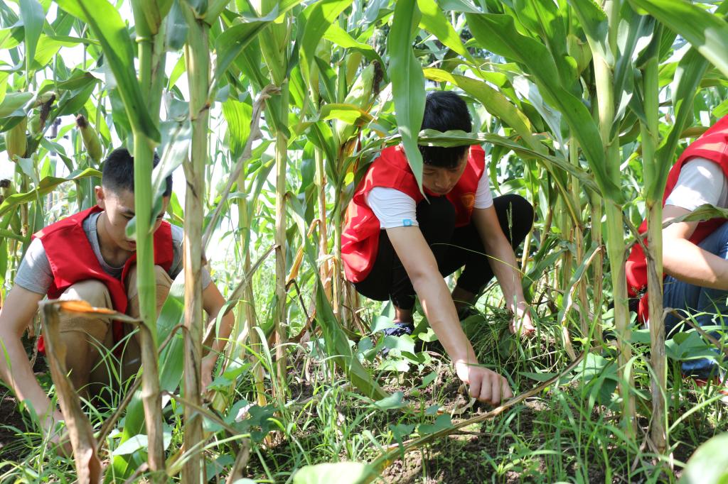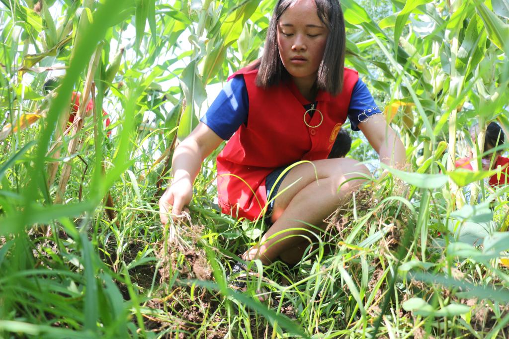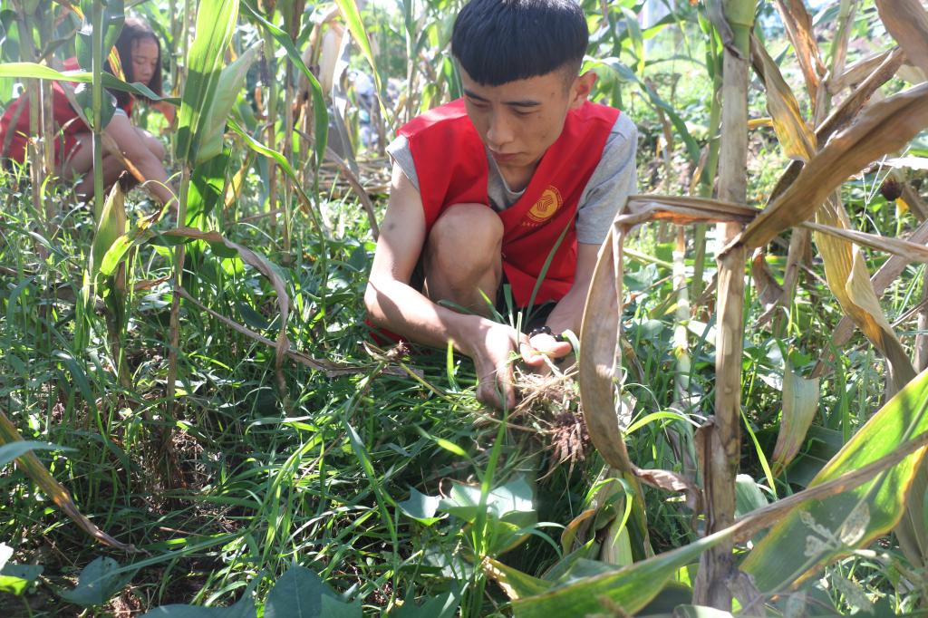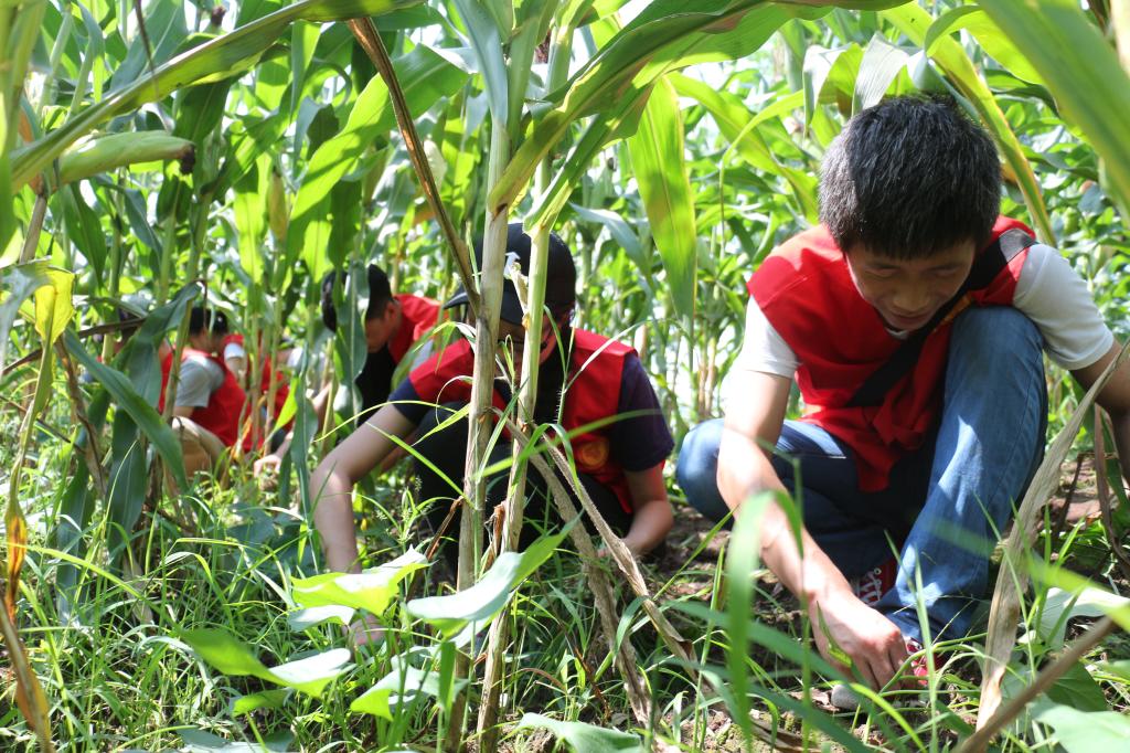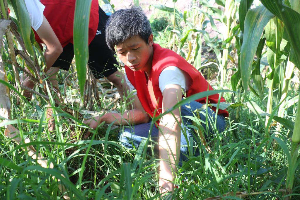 简单的寒暄告别之后,志愿者们顶着烈日,在村委工作人员的协调下,来到同村的黎继万爷爷家,黎继万爷爷一家原本居住在云阳县,因三峡水电工程的原因移居到此,政府为他们修建好了两层小洋房,还解决了自留地等问题,家中主要的劳动力也都在当地政府的协调帮助下到附近的工厂上班,而家中的农事则主要依靠老人家完成,我们一边在爷爷家的玉米地里拔除杂草,一边听爷爷给我们讲述他们这一群“移民”的故事。玉米田中,阳光和泥土的味道混在一起,志愿者们辛勤的汗水滴在农民的土地上,手臂各处被玉米叶割伤,被蚊虫叮咬奇痒难耐,但大家都坚持下来,这一实践虽身体辛苦,但心中甘甜无比。