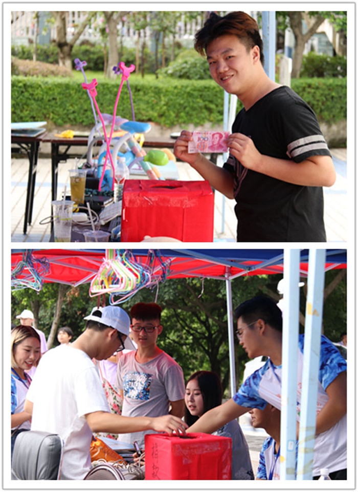 “同学,这个椅子和这个衣架怎么卖呢?”“同学,这个小桌子怎么卖?”在义卖点,学生的声音此起彼伏。在经过工作人员解释这次义卖不标价,不议价,不找零,所得资金均捐入学校爱心基金后,现场的气氛更加热烈了,每一个同学都踊跃参与活动。义卖点桌子上摆满了琳琅满目的商品,每个桌子四周都围满了同学,微凉的细雨没有阻挡学子的爱心,大家纷纷解囊,有些学生更是直接捐款,他们为学校的爱心资金注入了新的活力。