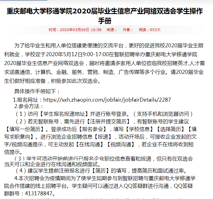 在线下招聘未恢复之际,为了给学生和用人单位搭建交流平台,我校于2020年5月12日举办了重庆邮电大学移通学院2020届毕业生信息产业网络双选会。