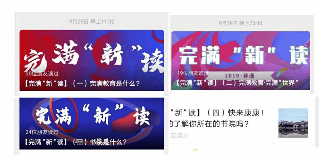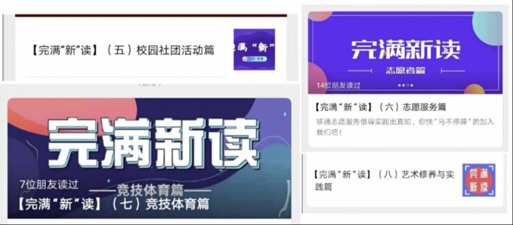 考虑到互联网时代下青年大学生的新特征、新习惯,本学年完满教育主题宣讲首次使用线上软文进行主题宣讲,完满教育委员会办公室、书院部宣传工作负责人,各版块主要负责人亲自执笔,在微信公众号“移通晓英才”上推出《完满“新”读》全新系列软文8篇,共计28000余字。全系列文章使用青年话语体系,文风偏活泼的同时不失内涵解读,用00后看得懂、喜欢看的文字讲述完满教育的前生今世、育人理念、内容内涵、工作体系、成绩成果等,文章一经推出阅读量迅速攀升,全系列文章受到广大师生一致好评,有同学表示“第一次看到有人这样解读高大上的完满教育,看起来觉得好玩,看完了觉得内容丰富,让人很想去试试”。