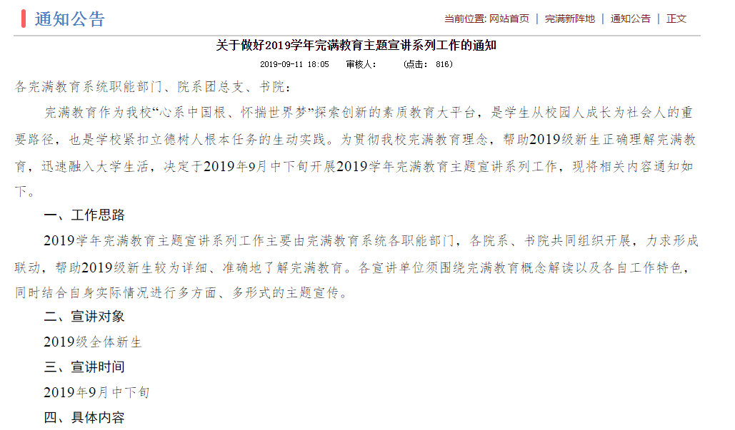 本次宣讲主要由完满教育系统各职能部门,各院系、书院共同组织开展,切实形成联动,整个宣讲包括了校级集中宣讲,院系、书院宣讲、软文宣讲、专项宣讲4个部分,充分利用“移通之星”等榜样人物发挥朋辈引领作用,集中力量打造了《完满“新”读》等系列软文,实现了学校新生全覆盖,整体宣讲效果好、影响大、亮点突出、覆盖广泛,真正为2019级新生较为详细、准确地了解完满教育打下坚实基础。
