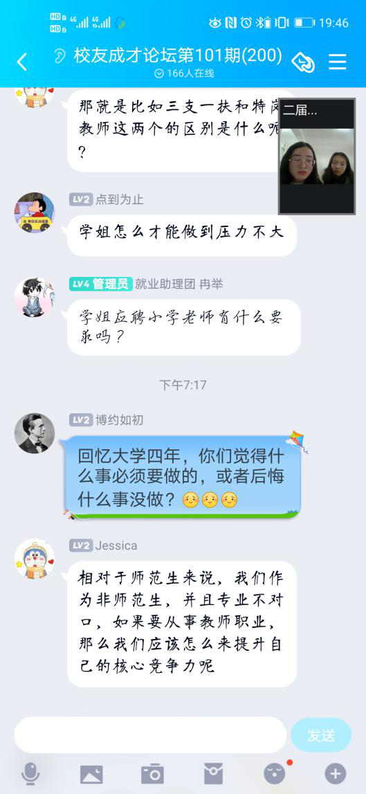 活动最后,校友们跟同学们分享了一些他们在新疆的一些所见所闻,每一位同学都在认真的听,不亦乐乎!这次“校友成才”虽然不像往年一样,邀请到他们回校分享,而是以线上的形式进行分享。但是,每一种模式都有好处,同学们都了解到,学到了许多知识。希望“校友成才”的活动能不断延续,邀请到各行各业的校友为我们分享她们的故事和经验。