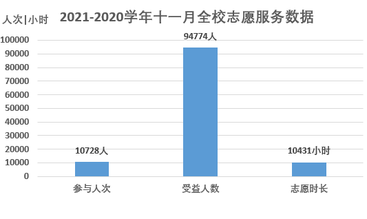 本月我校共计进行志愿活动累计达107期,累计参与志愿服务人次达10985人,累计志愿服务时长达10688小时,累计受益人数达95031人,这就是十一月份志愿服务取得的佳绩。赠人玫瑰,手留余香。志愿者们有幸苦付出也会有意义的收获,爱心志愿服务永不停歇。