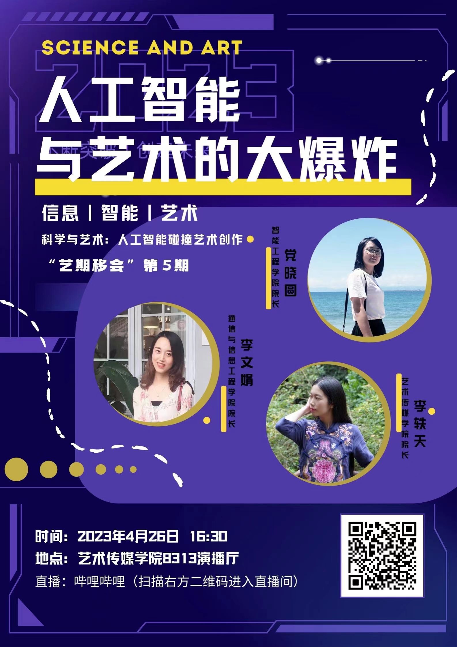 艺术传媒学院打造的“艺期移会”第五期节目《科学与艺术:人工智能碰撞艺术创作》正是立足于这样的背景,为广大师生带来一场多学院的联动和智慧碰撞。4月26日星期三下午16:30分,直播节目正式开始。
