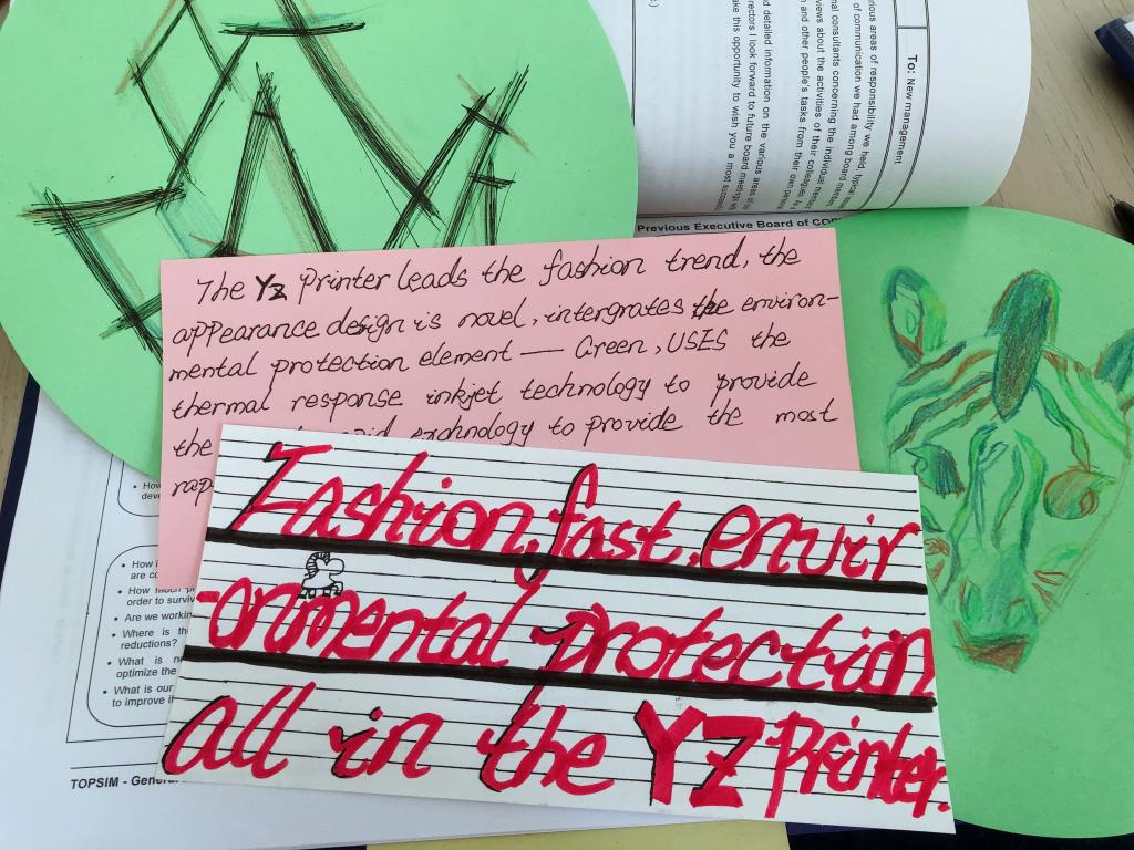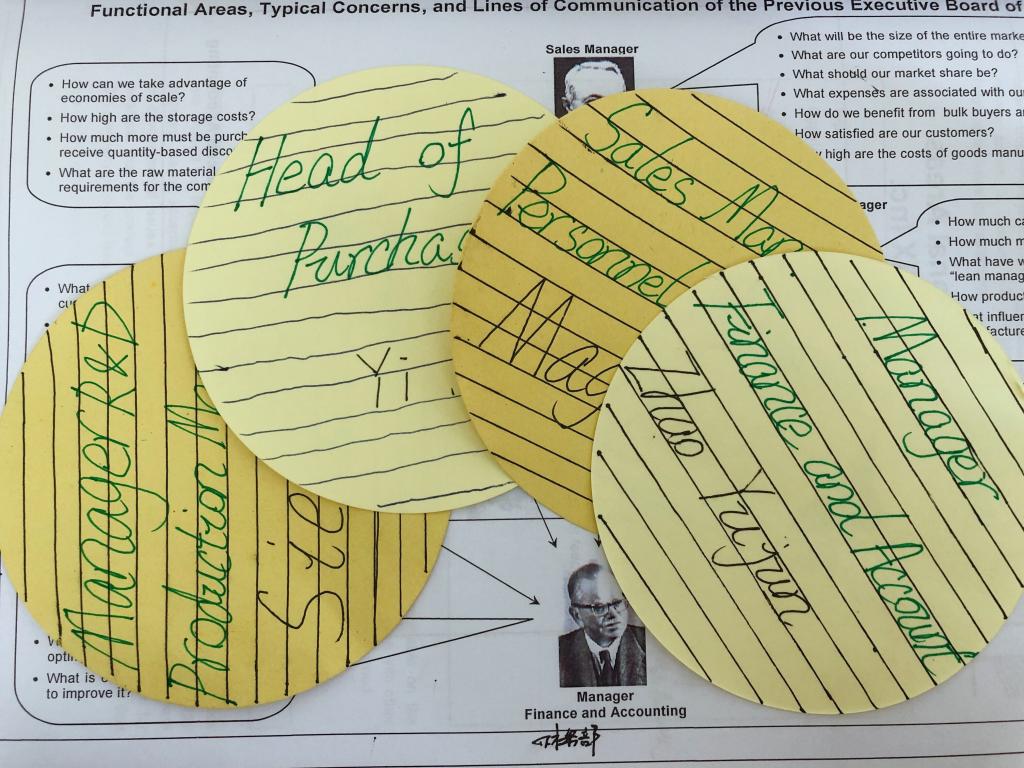 课上我们围坐在一起,共同商讨企业的构件,从部门文化的创建到角色的扮演,拿起手中的画笔,勾勒五彩logo。我们构想发展的数据、思索标语,在团队无数奇思妙想的汇聚中,造就了这一个个强大的企业。老师细心地将企业数据输入,针对财务赤字、债务风险、环境投资等一一讲解,引导我们形成独具一格的思考方式。