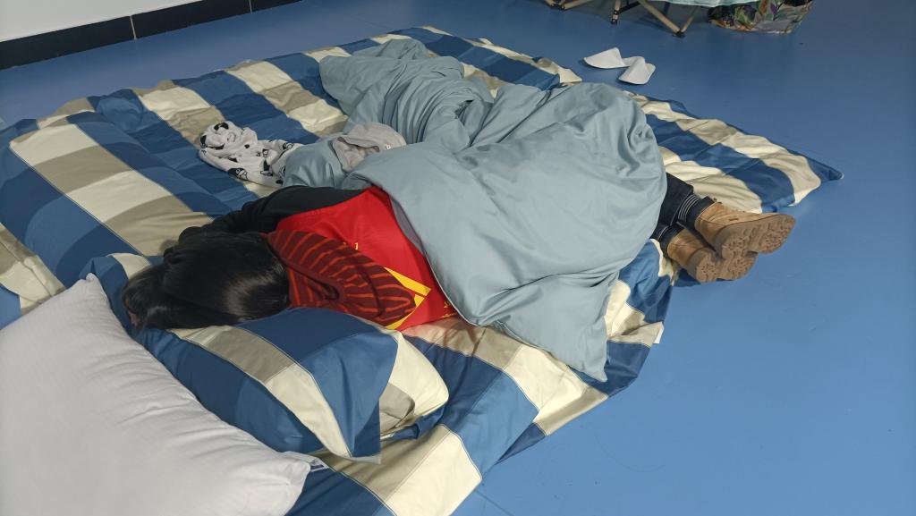 中午的疲累还没休整,学生核酸检测、晚餐配送、第2天早餐准备又接连开始。当午夜1点多回到智慧教室,连脱衣服的力气都没有了,老师们席地而卧,进入梦香,此时据进驻北山已整整19个小时。