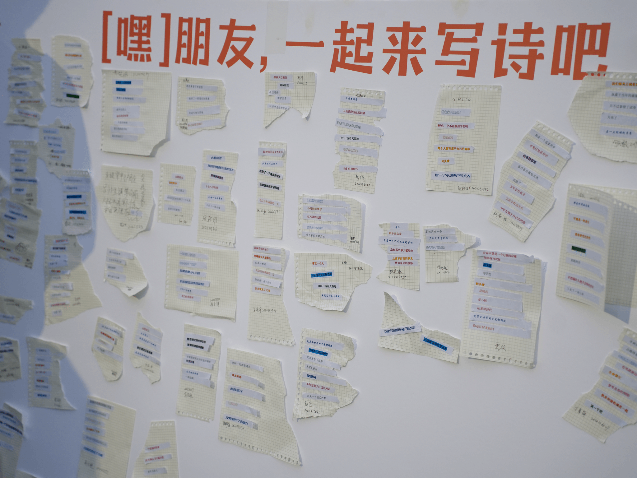 “浪漫”“快乐”“尘埃中野蛮成长”“少年”“天亮了”“时间”“人生路很长”活动现场为同学们提供了许多可任意拼组的词语和句子,完成了主题构思后,参与的同学们在词句库中挑选自己感兴趣的、需要的词句条并剪下来,将原有词意和句式打散,重组成为一首新的诗歌,并取名、落款,粘贴在展示区内,拼凑为一大本“诗歌集”。