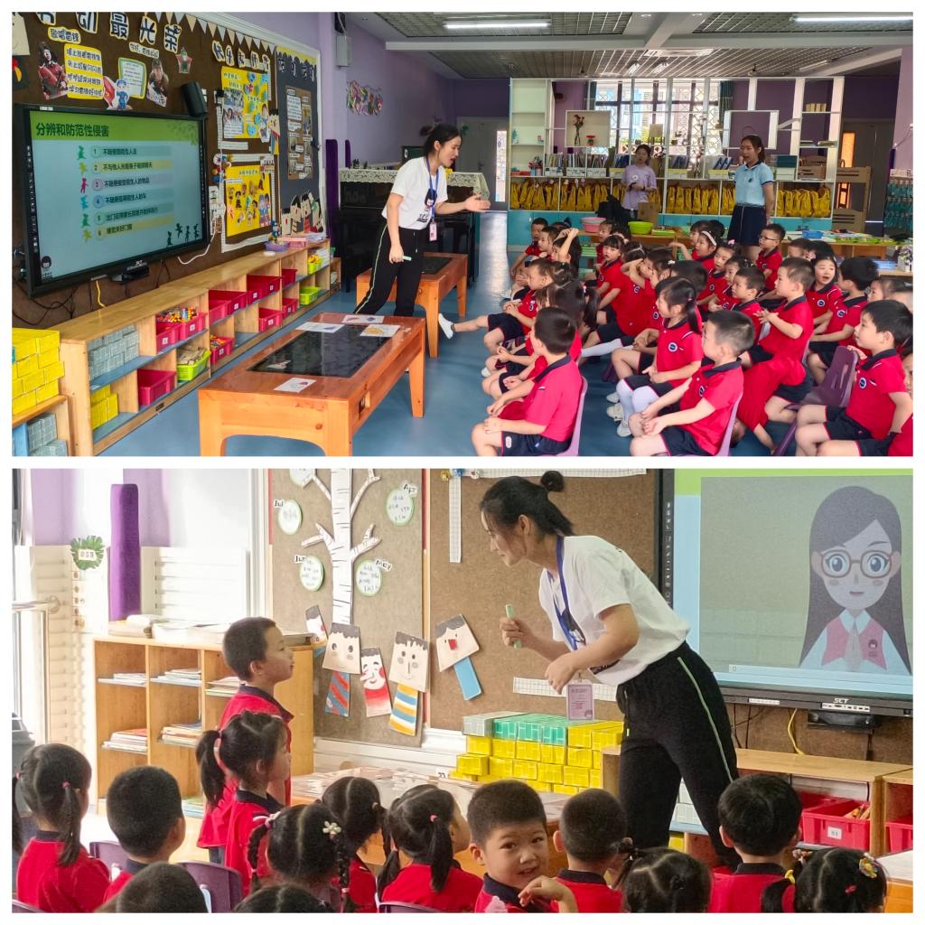 在“分辨性侵害”的主题中,杨老师邀请了一位女同学上台互动。通过师生间的演绎,直观地向小朋友们呈现“好”与“不好”的身体触碰,让他们学会分辨性侵害。而“防范性侵害”的教学中,杨老师使用了大量情景性提问,比如“遇到陌生人问路,该怎么办”“陌生人要给你好吃的、好玩的,你会接受吗”“有个邻居约你单独去他家玩,你会怎么办”……小朋友你一言我一语,争先恐后地说出了自己的办法。