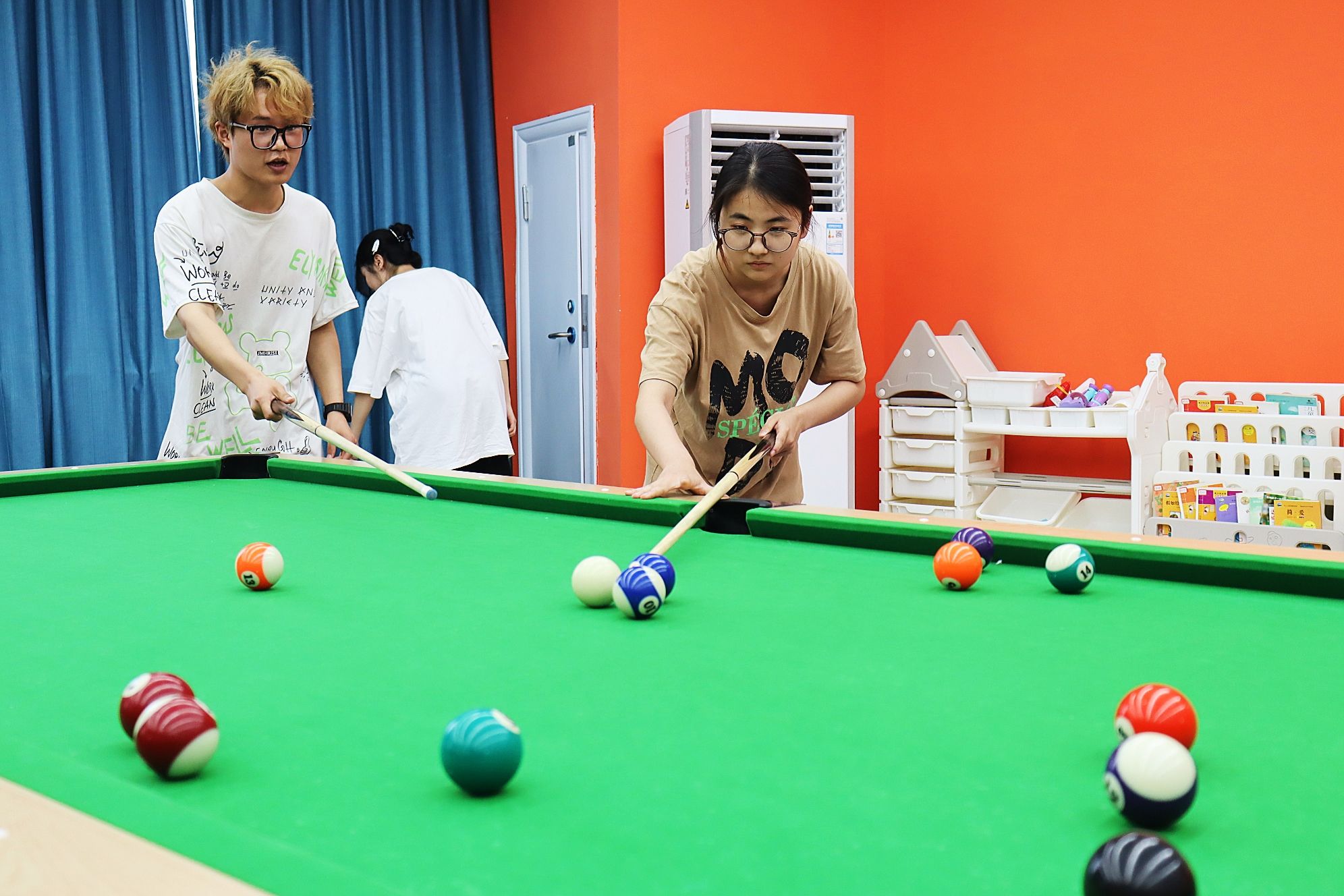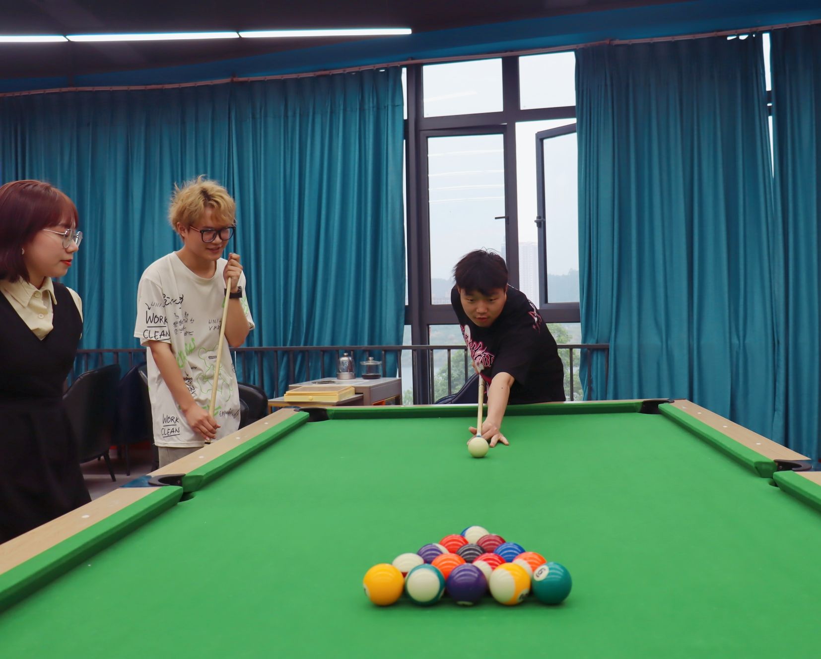 随后移步至台球桌旁分组进行实战演练。部分师生第一次沉浸式体验台球运动,由李俊峰、姚晶同学担任小组长,从握杆、打球姿势及击球技巧等方面一对一带领队员学习,队员们突破紧张、自我挑战,在一次次实践中越发精准。随后分为两队,开展对战,队长、队员纷纷进球,迎来欢呼和掌声。