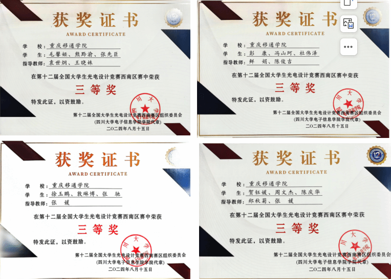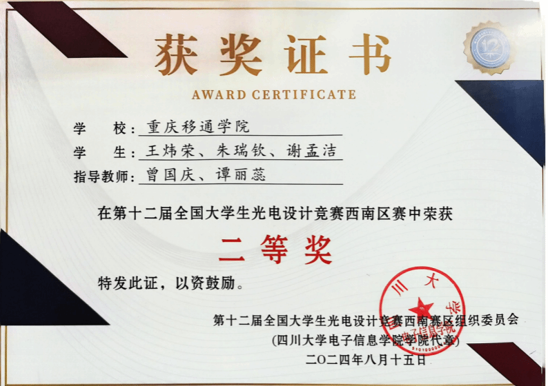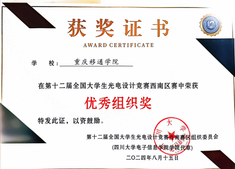 7 月 29 日,由中国光学学会主办、四川大学电子信息学院承办的第十二届全国大学生光电设计竞赛(西南区赛)决赛在四川大学隆重举行。全国大学生光电设计竞赛作为面向全国高校各专业学生的A类学科竞赛,学科交叉性强、创新性突出、实践性强、权威性高且影响力大,为学子了提供广阔舞台。本次竞赛活动由通信与信息工程学院组织,学院在众多参赛院校中脱颖而出,荣获优秀组织奖。在本届西南区选拔赛中,我校共派出 14 支参赛队伍,经过激烈角逐,最终斩获二等奖 1 项、三等奖 4 项。