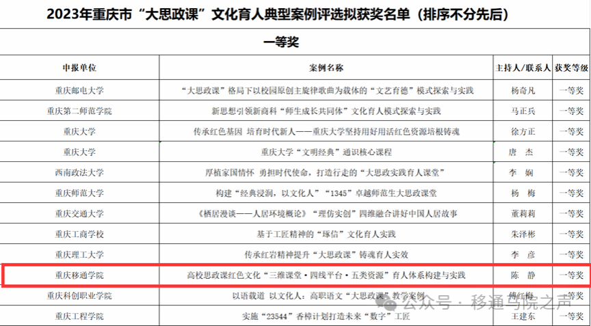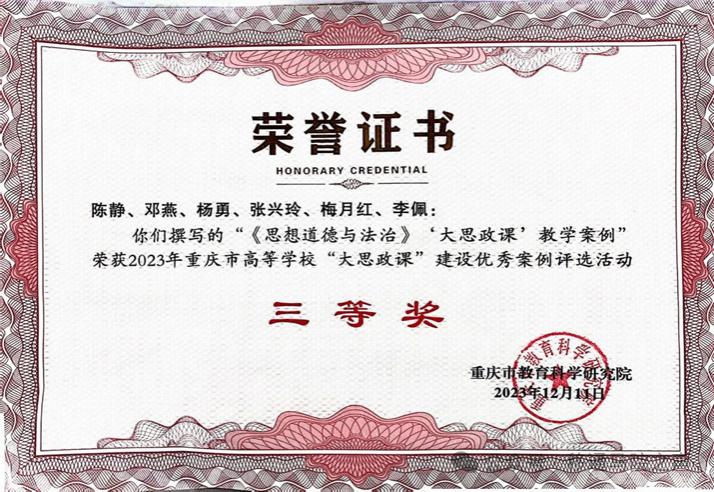 近日,2023年重庆市“大思政课”文化育人典型案例评选活动评审结果揭晓,马克思主义学院陈静老师提交的案例《高校思政课红色文化“三维课堂·四线平台·五类资源”育人体系构建与实践》荣获一等奖。