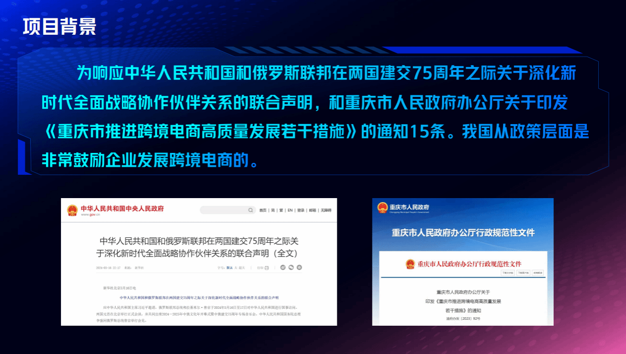项目为响应中华人民共和国和俄罗斯联邦在两国建交75周年之际关于深化新时代全面战略协作伙伴关系的联合声明,和重庆市人民政府办公厅关于印发《重庆市推进跨境电商高质量发展若干措施》的通知15条。项目在俄罗斯市场跨境电商领域成功实现了中国品牌出海的联合运营模式。通过与优质供应商的紧密合作,深入进行市场调研与定位,高效地运营了跨境平台,具备良好供应链管理,开展矩阵运营,销售成绩良好,同时提供代运营服务,目前已于3家单位深度合作。在项目实施过程中,结合俄罗斯本土平台OZON与最大社交平台Vkontakte,利用大数据分析策略精准洞察市场需求,成功实现了月销售额的显著增长。