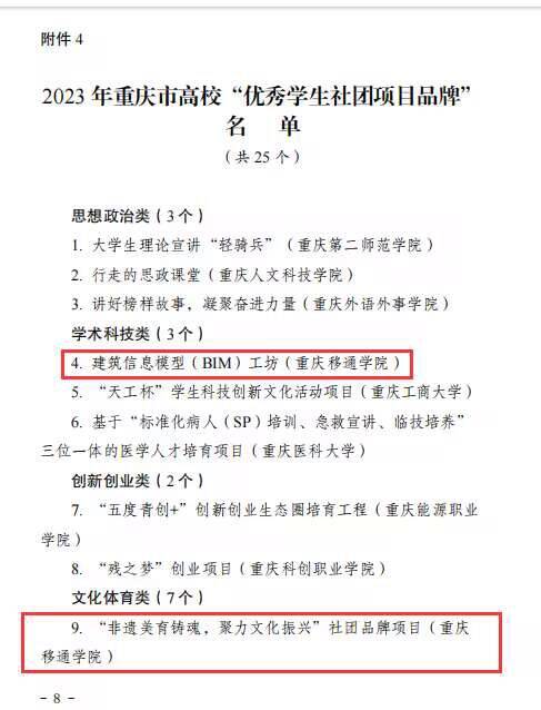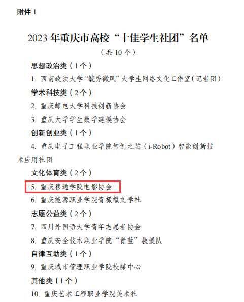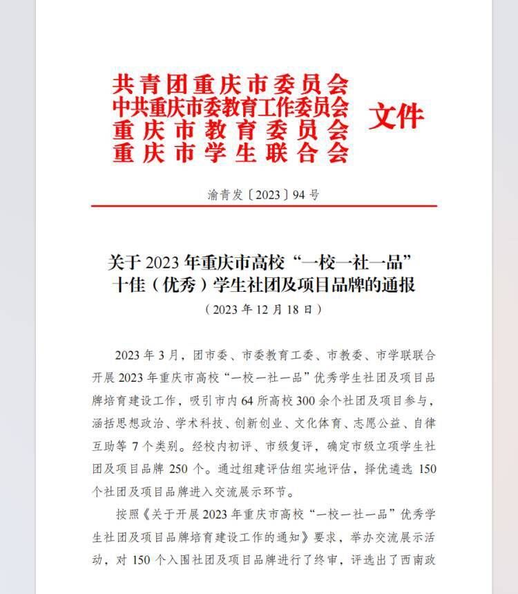 12月18日,由团市委下发的关于 2023 年重庆市高校“一校一社一品”十佳(优秀)学生社团及项目品牌的通报,我校电影协会上榜“十佳学生社团”,我校2个学生社团项目:建筑信息模型(BIM)工坊、“非遗美育铸魂,聚力文化振兴”社团品牌项目,获得“优秀学生社团项目”,在本次重庆市各高校学生社团领域评选的共75个表彰中,我校共获得3项荣誉佳绩。