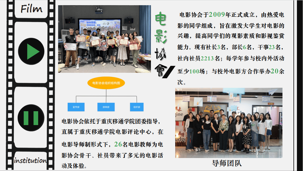 电影协会自2009年成立,现有社员2000余名,电影评论中心作为电影协会强大的导师团,社团致力“品牌项目建设”开展由电影社团孵化开展校内大学生影评大赛到学校大力支持升级为市级到发起“钓鱼城·全国大学生影评大赛”至今已成功举办7届,累计吸引到全国400多所高校学生参与,社团在校内长期开展周末观影、影展进校园、电影路演、新片速递、电影沙龙等活动项目。以影评促进电影青年的思考与建设,实现影评能力提升及电影教育发展的同频共振,把电影协会带出学校,带到戛纳、带到全国,对社团未来的希冀,将会是本次答辩标题中《全世界最好的电影协会》。