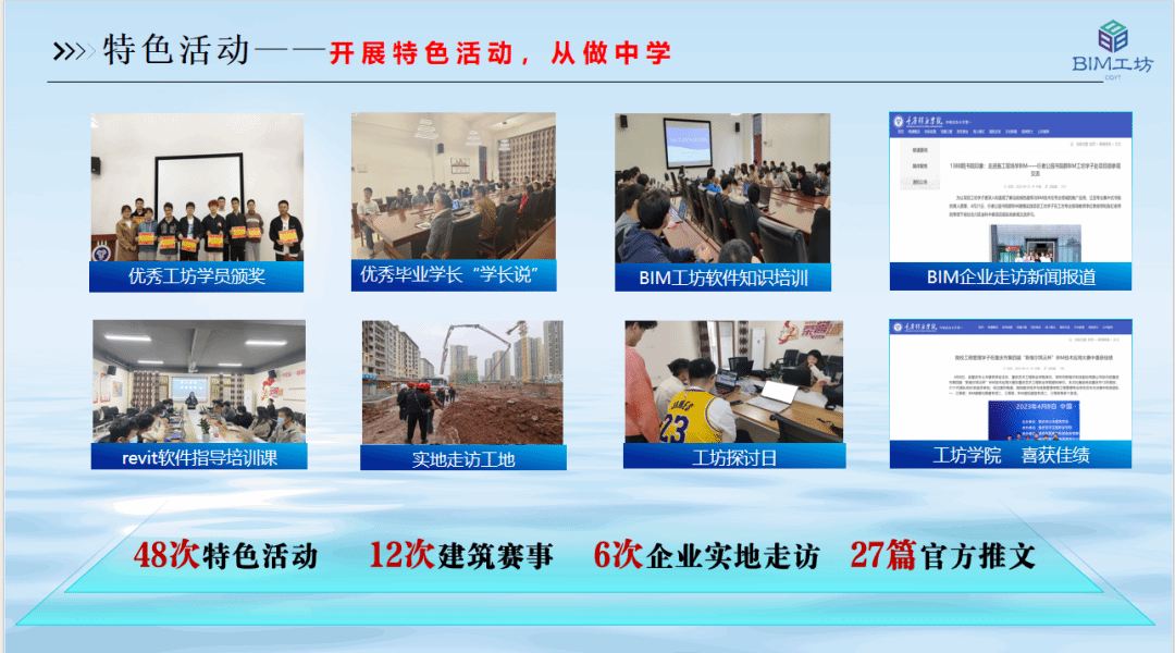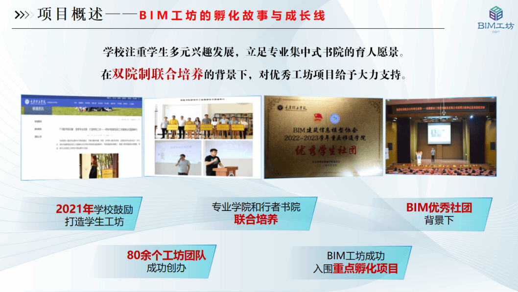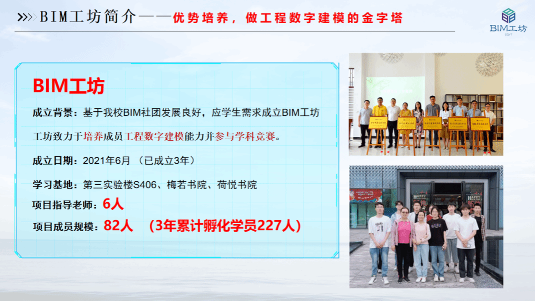 我校建筑信息模型(BIM)工坊是由BIM建筑信息模型协会孵化而来,立足双院制建设的背景下,由团委、学院、书院三方共同扶持指导建设。工坊从工程类专业兴趣活动、学科竞赛、科研项目和校友论坛入手,培养相关专业学生的创新科研能力和实践能力,建立分层递进、多维融合商科背景下的企业管理式科技学术工坊。截止目前工坊在BIM设计大赛、高教杯等专业赛事上获得了多项奖项及荣誉,后续以专业化融合将是我校学科类社团的未来发展方向。