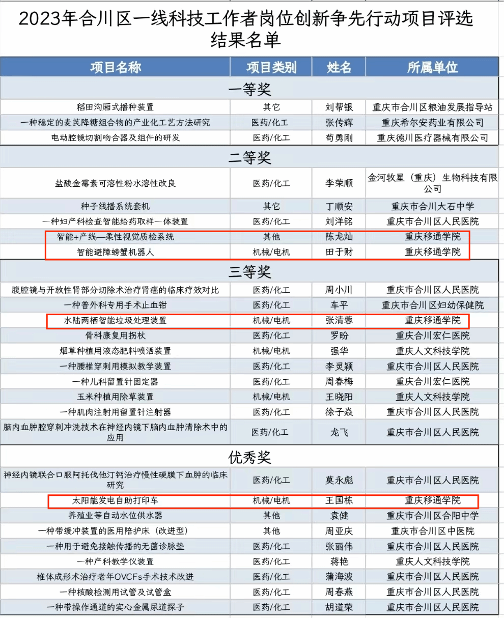 近日,重庆市合川区科协举办了一线科技工作者岗位创新争先行动项目评选,我校智能工程学院推荐的作品经过公开、公平、择优的评审,最终斩获二等奖两项,三等奖一项,优秀奖一项,我校获优秀组织奖。