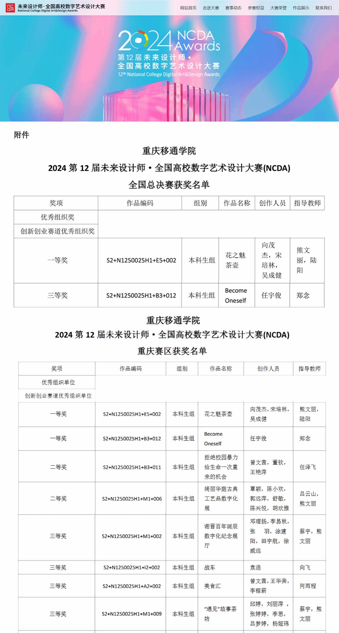另外,在第12届未来设计师·全国高校数字艺术设计大赛重庆省赛区,大数据学院共有8件作品获奖,其中,一等奖2项、二等奖2项、三等奖4项,同时,熊文丽老师获得国赛“优秀指导教师”,郑念、吕云山、任泽飞、蔡宇、陆阳、向飞、何雨程六位老师获得重庆赛区“优秀指导教师”。获奖作品题材涵盖产品、视觉、游戏,虚拟等等展现了学子们出色的创新意识、实践能力和团队精神。