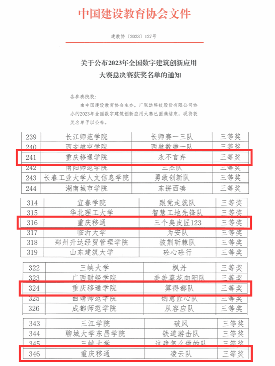 近日,2023年全国数字建筑创新应用大赛全国总决赛落下帷幕,经过校内选拔、全国模拟赛、全国总决赛层层角逐,由周梦娇、李红艳、张红、徐桂霄、杨礼静、刘艳利等老师指导的学生参赛团队荣获本科组全国三等奖4项。