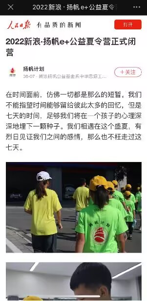 此次公益夏令营的成功举办,是借助社会力量、整合学校资源,践行“引进来”的生动呈现。活动整体采取“参观+教学+体验”相结合的方式,融合我校特色完满教育理念,因地制宜,开设有素质拓展、朗诵、演讲、助残志愿服务等特色课程,旨在增强营员自信心,培养其独立思考、语言表达、团队协作等能力,让营员学会悦纳他人,懂得感恩。各类特色活动的展开,为孩子们创造了一次不一样的假期体验。本次夏令营得到了中华思源工程基金会、新浪扬帆公益基金的极大肯定和支持,并被人民日报等全国新闻媒体报道,采取微博、微信、抖音等新媒体实时转播小朋友为期8天的夏令营生活,浏览及转发量达4W余次;同时,拍摄制作出《播种》《生根》《萌芽》《成长》以及《消防队特辑》系列宣传片,来呈现本次夏令营中小朋友的收获和成长。