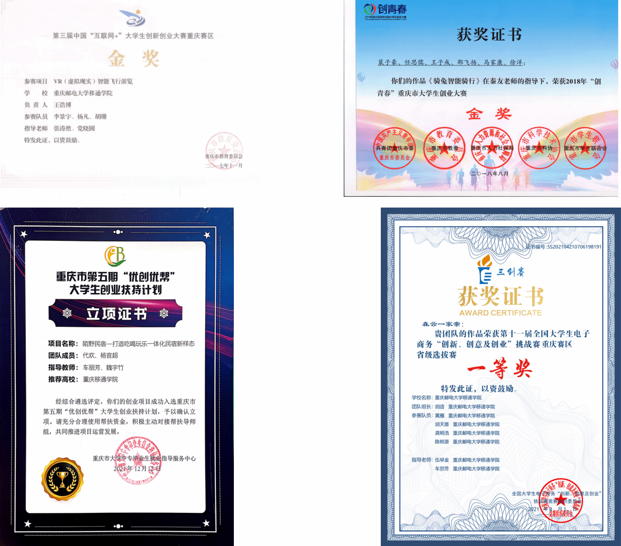 通过在创新创业工作和双创育人体系上的持续投入,我校也在相关领域获得了良好的成绩。近年来,学生参加国家级、省部级各类学科竞赛活动,共获奖1010项,国家级获奖111项。其中VR(虚拟现实)智能飞行游览项目获得中国“互联网+”创新创业大赛全国铜奖、重庆市金奖;孵化基地先后被评为重庆市大学生创业示范基地、重庆市高校众创空间、重庆市创业孵化基地、等多项荣誉,经过近几年的工作实践,我校的创新创业工作取得了一定的成效,形成了正面积极的社会影响。